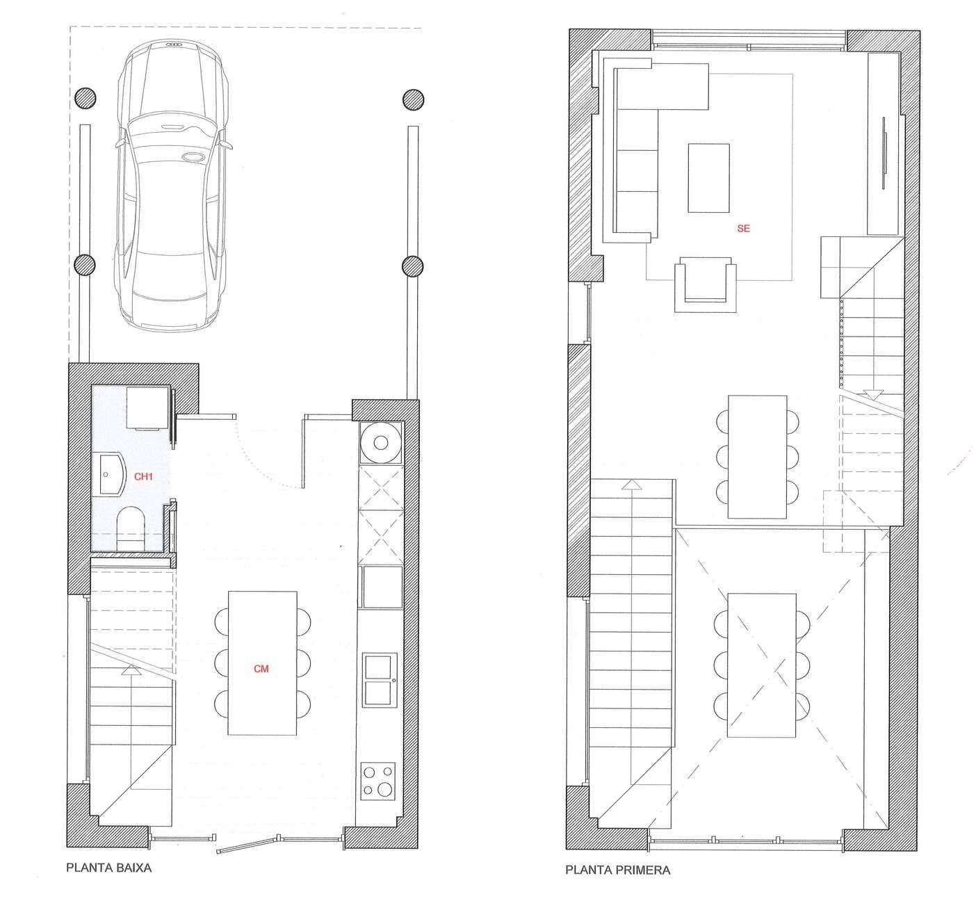 Planta baixa a nivell de carrer, entrada a la vivenda amb ampli espai obert de cuina/menjador de 25 m2 amb sortida al jardí 37 m2, bany complert amb plat de dutxa.